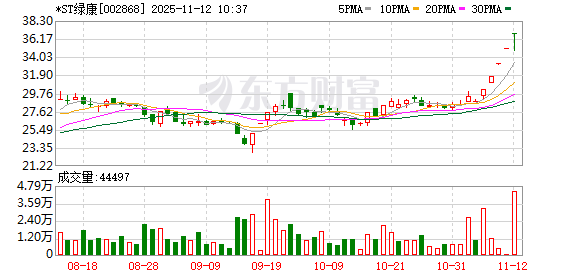 *ST绿康盘中涨停,已连收5个涨停板,截至9:25,该股报36.77元,换手率0.01%,成交量2.21万股,成交金额81.26万元,涨停板封单金额为3039.41万元。连续涨停期间,该股累计上涨27.63%,累计换手率为3.30%。最新A股总市值达57.15亿元,A股流通市值56.64亿元。